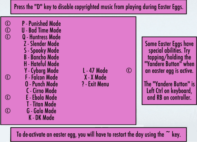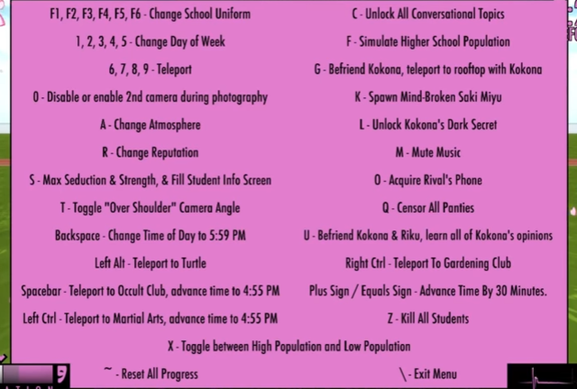 - W poprzednich aktualizacjach, istniał błąd w którym, kiedy Info-chan była w swoim klubie, jej okulary ”lewitowały” nad jej głową, dzięki czemu jeśli gracz dostał się tam za pomocą modów, mógł zobaczyć jej twarz.
